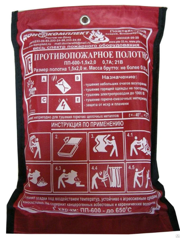 Полотно выполнено в виде прямоугольного отрезка термостойкой ткани, сложенной в укладку и помещенной в специальный чехол, который легко крепится в любом доступном месте и надежно удерживает полотно в сложенном состоянии, а также позволяет экстренно извлечь и раскрыть его. Рекомендуется для тушения очагов возгораний в квартирах, гаражах, производственных помещениях (цехах, мастерских, лабораториях и т.д.), на дачах, тушения горящей одежды на пострадавших, для защиты от искр и пламени.